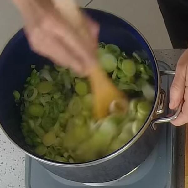 Na ulju propržite praziluk isečen na tanke kolutove. Potom mu dodajte sitno izrendanu šargarepu i pržite minut do dva.