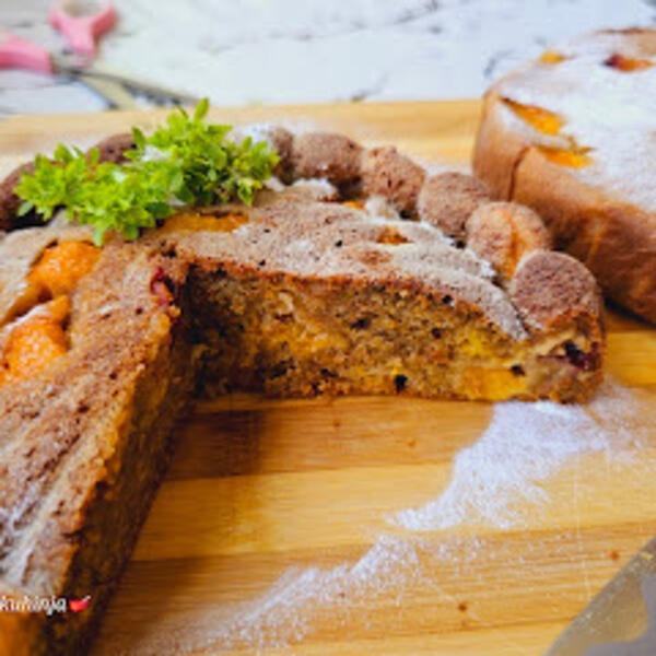 Dodati voće po želji na kockice. Sve polako izjednačiti i sipati u 1 kalup ili dva manja obložena pek papirom.