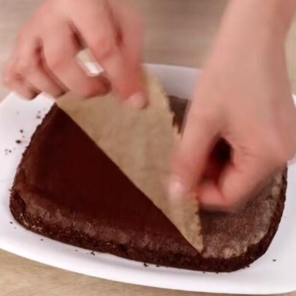 Pecite na 180 stepeni oko 50 minuta. Kada je kolač gotov, izvadite iz rerne i okrenite ga, pa pek papir uklonite sa kolača.