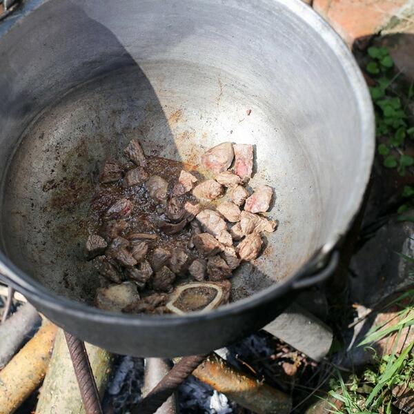 Dodajte junetinu koju ste prethodno isekli na kockice. Odmah ubacite i sve začine - lovorov list, so, biljni začin, biber, tucanu papriku u količini koja vama odgovara. Samo beli luk ostavite za kraj. Nalijte vodu u šerpu toliko da prekrije meso. Posle više ne dodajete vodu tokom kuvanja.