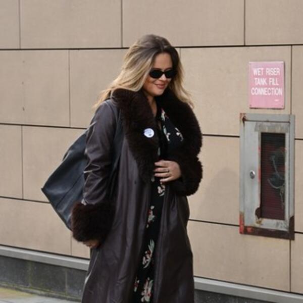 Emili je blistala u modernoj sivoj rebrastoj haljini i bež mantiliću, a ovo trendi izdanje jasno je pokazalo njen poveći trudnički stomak.