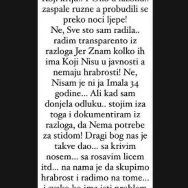 - E, ovako, pošto mi inboks već gori, ja nisam tip devojaka koje kriju i ono, u fazonu, zaspale ružne i probudile se lepe preko noći. Ne, sve što sam radila radila sam transparentno jer znam koliko ih ima koji nisu u javnosti, a nemaju hrabrosti. Ne, nisam ni ja imala 34 godine. Ali kada sam donela odluku, stojim iza toga i dokumentujem sve to jer nema potrebe za stidom. Dragi Bog nas je takve dao, sa krivim nosem, sa rošavim licem i tako dalje. Na nama je da skupimo hrabrosti i radimo na tome. Svako ko ima isti problem, znam kako je. Sva sreća pa živimo u 21. veku, gde smo napredovali medicinski i postoji mogućnost. Meni je koža večito problem bila - zaključila je Pašovićeva.