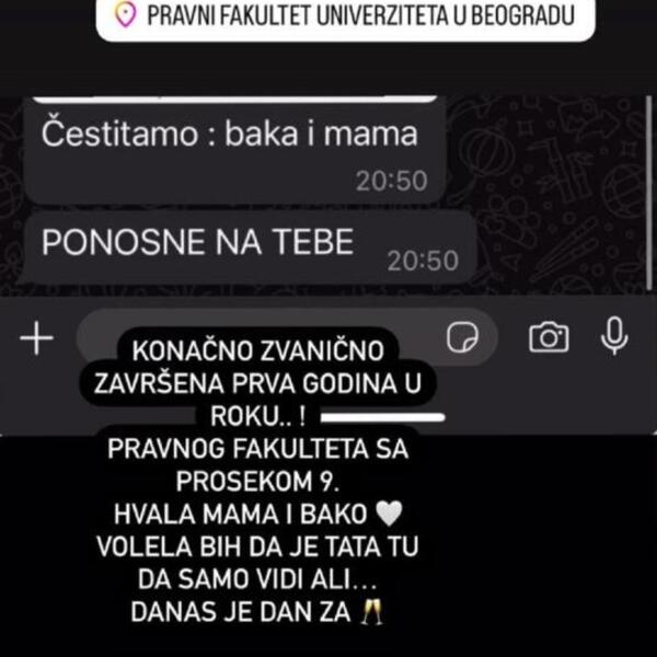 - Konačno zvanično završena prva godina Pravnog fakulteta u roku, sa prosekom 9 - saopštila je Kija, pa dodala:
