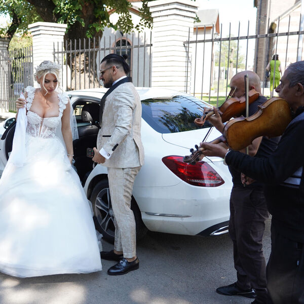Milica je blistala u venčanici popularnog princeza kroja sa dekolteom, dugačkim velom, dok je Bora imao novo zlatno odelo.