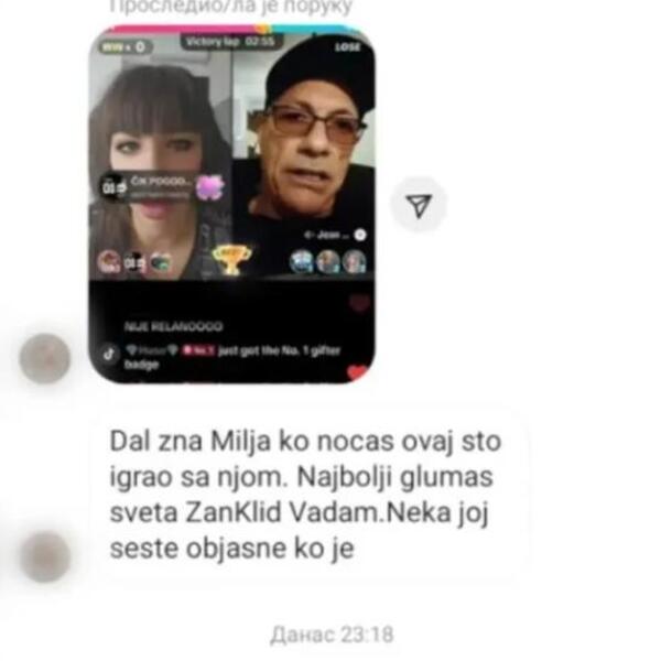 - Da li zna Milja ko je noćas ovaj što je igrao sa njom. Najbolji glumac sveta Žan Klod Van Dam. Neka joj sestre objasne ko je - glasila je jedna poruka, na koju je Marija odgovorila: