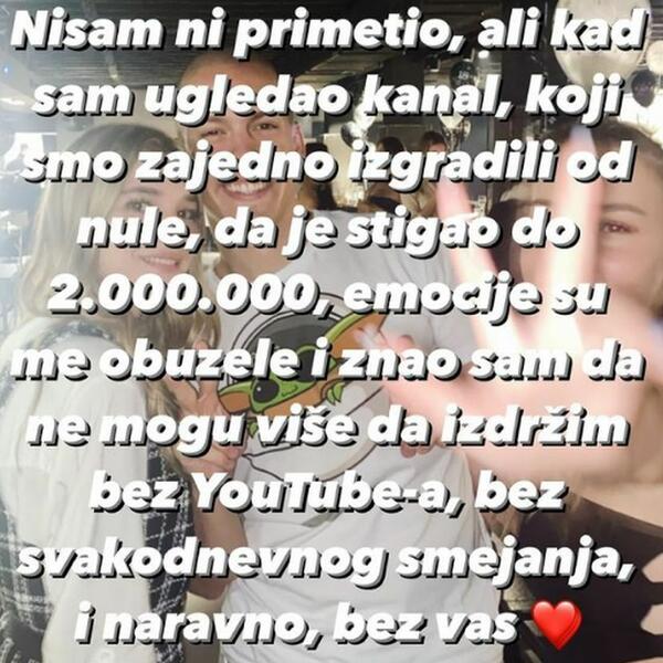 - Nisam ni primetio, al kad sam ugledao kanal, koji smo zajedno izgradili, od nule, da je stigao do dva miliona, emocije su me obuzele i znao sam da ne mogu više da izdržim bez Jutjuba, bez svakodnevnog smejanja i naravno bez vas.