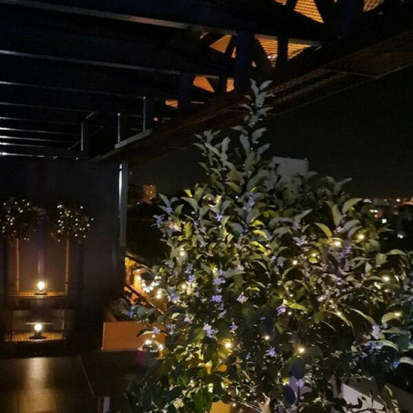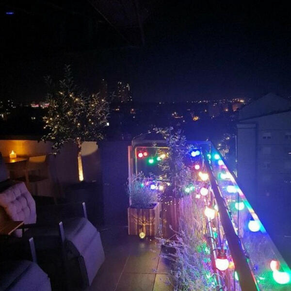 Prostrana terasa, po svemu sudeći, ima i stolice i udobne ležaljke. Svaki ćošak je u biljkama, a šarene lampice svakako su zanimljiv detalj. Kako se nalazi na poslednjem spratu zgrade, piše „Blic", pogled „puca" na sve strane.