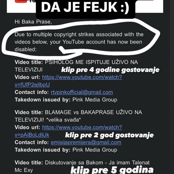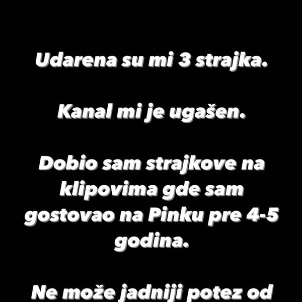 "Dosta vas mi govori da napravim novi kanal, ne mogu.Želim da se borim za ovaj. 6 godina rada, truda i uspomena. Ovo je možda poslednje zbogom", napisao je Baka.