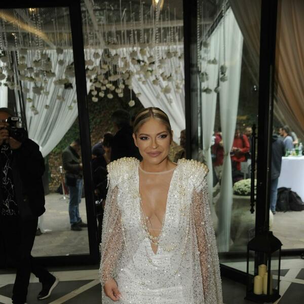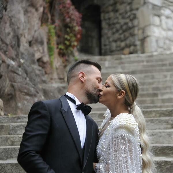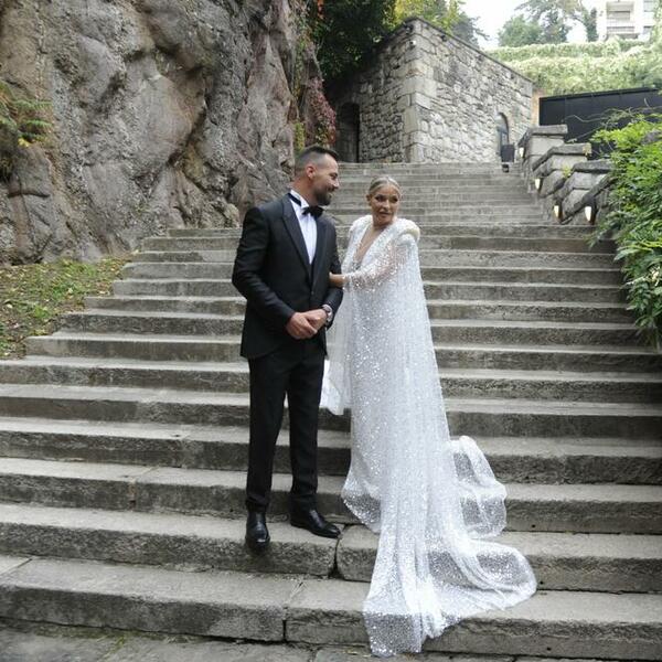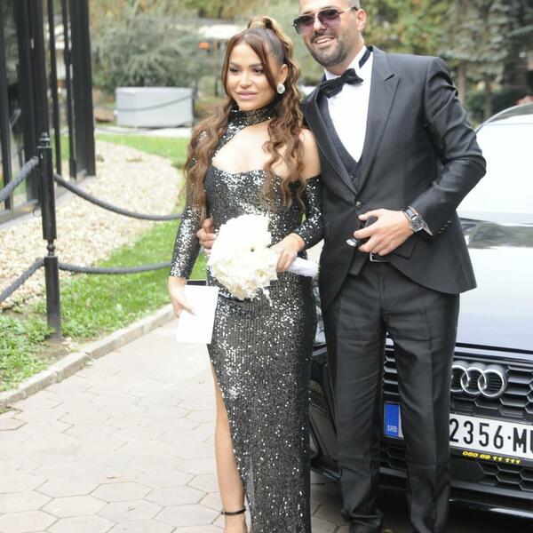 Vanja je obukla raskošnu belu venčanicu sa kristalima, a svi su se pitali gde je njen suprug Aleksandar. On se pojavio u crnom odelu sa leptir mašnom, vidno raspoložen zbog srećnog dana.