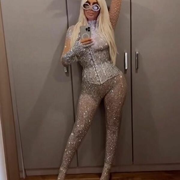 Jelena je na sebe navukla skupoceni kombinezon koji je isticao njene bujne atribute, a struk posebno naglasila steznikom koji je takođe bio ukrašen sitnim kristalima.