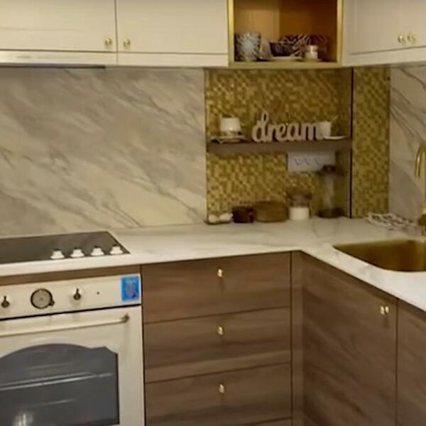 Kuhinja je u bež i braon tonovima, ali i sa zlatnim detaljima poput slavine, sudopere i ručki.