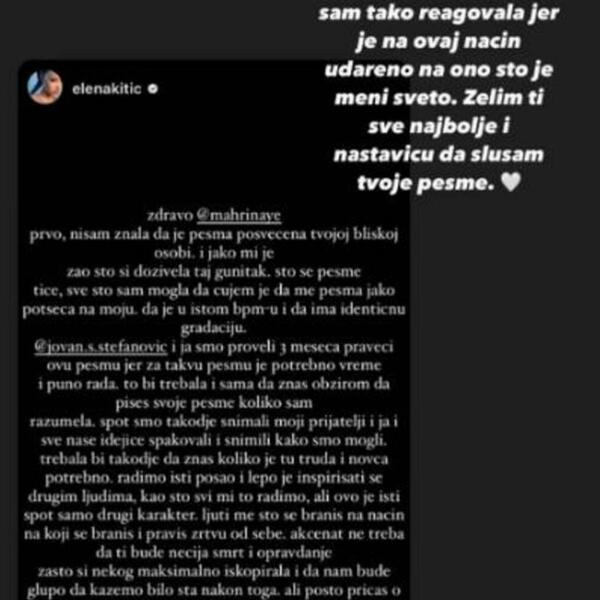 Radimo isti posao i lepo je inspirisati se drugim ljudima, kao što svi mi radimo, ali ovo je isti spot samo drugi karakter, ljuti me što se braniš na način na koji se braniš i praviš žrtvu od sebe, akcenat ne treba da ti bude nečija smrt i opravdanje zašto si nekoga maksimalno iskopirala i da nam bude glupo da kažemo bilo šta nakon toga. Pošto pričaš na Tiktoku i skupljaš simpatije moram i ja da ti odgovorim. Toliko od mene stavljam tačku na ovu temu jer mi je ovo sve previše. Ko me razume, razumeće - napisala je Elena na šta joj je Mahrina odmah odgovorila:
