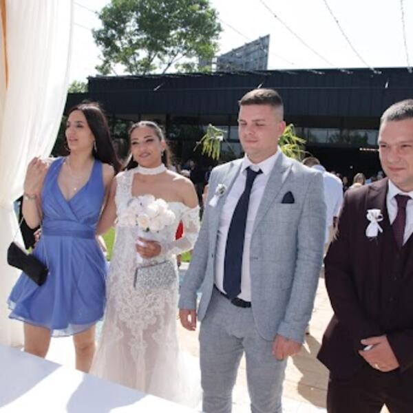 Mladenci su blistaju od sreće i uzbuđenja, ljubili su se sa zvanicama, grlili, ali i plesali, a sve vreme je srpska trobojka.