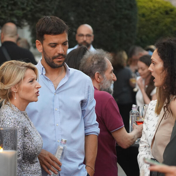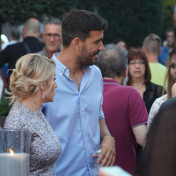 Anđa je oduševila sve svojom odevnom kombinacijom u kratkoj haljini sa šljokicama, koje je uparila sa ljubičastim sandalama na štiklu, a on je izabrao svetlo plavu košulju te su bili odličan spoj.