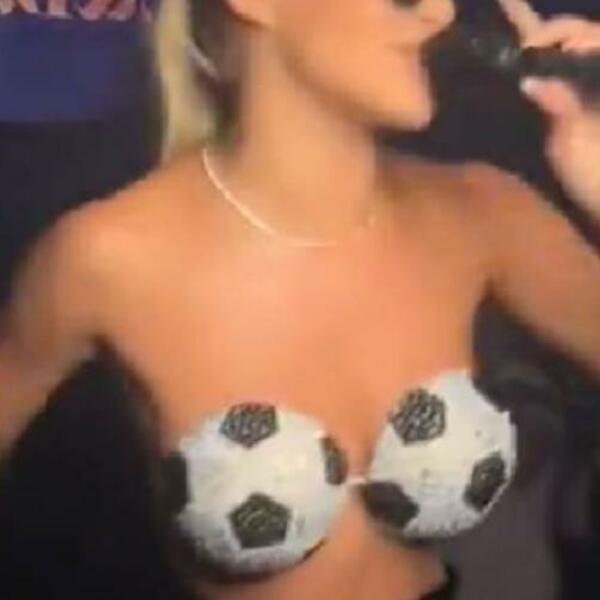 Pevačica koja je ranije pred publiku izlazila u tanga gaćicama, sada je rešila da pokrije zadnjicu suknjom na kojoj je pisalo njeno prezime "Radujko", dok je grudi prekrila fudbalskim lopticama.