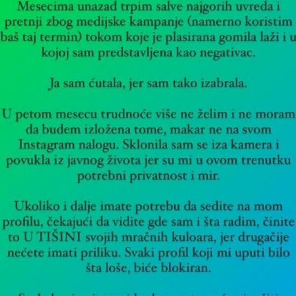 - Mesecima unazad trpim salve najgorih uvreda i pretnji zbog medijske kampanje (namerno koristim baš taj termin) tokom koje je plasirana gomila laži i u kojoj sam predstavljena kao negativac. Ćutala sam, jer sam tako izabrala. U petom mesecu trudnoće, više ne želim i ne moram da budem izložena tome, makar ne na svom Instagram nalogu. Sklonila sam se iza kamera i povukla iz javnog života jer su mi u ovom trenutku potrebni privatnost i mir - napisala je ona i dodala da će od sada blokirati sve koji joj budu pisali negativne stvari.