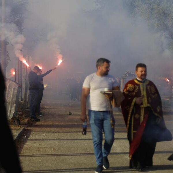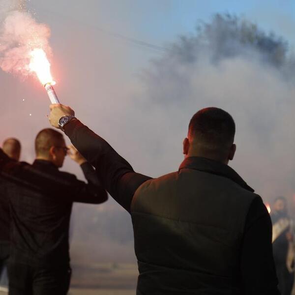 Dok se povorka kretala ka mestu večnog počinka navijači Crvene zveze su zapalili baklje i oprostili se od Aleksandra.
