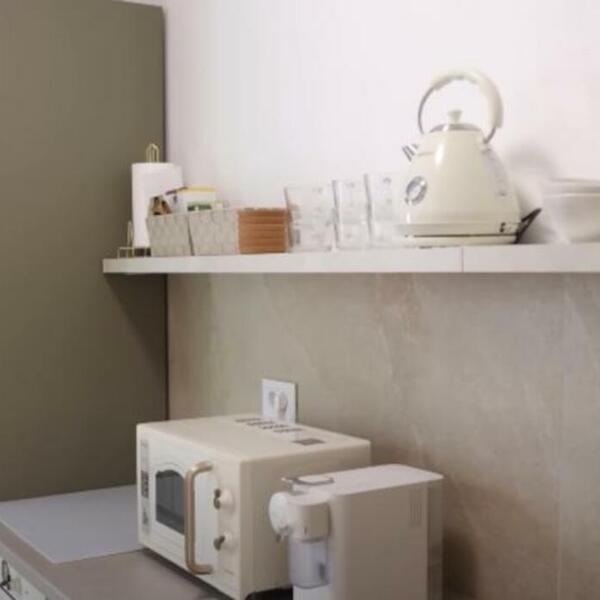 U stan se ulazi kroz dug hodnik, iz prostrane dnevne sobe se izlazi na terasu, ali i u kuhinju, gde ima i nekih starinskih elemenata, a mnogima se posebno dopalo što umesto klasičnih visećih delova ima police na kojima drži stvari.