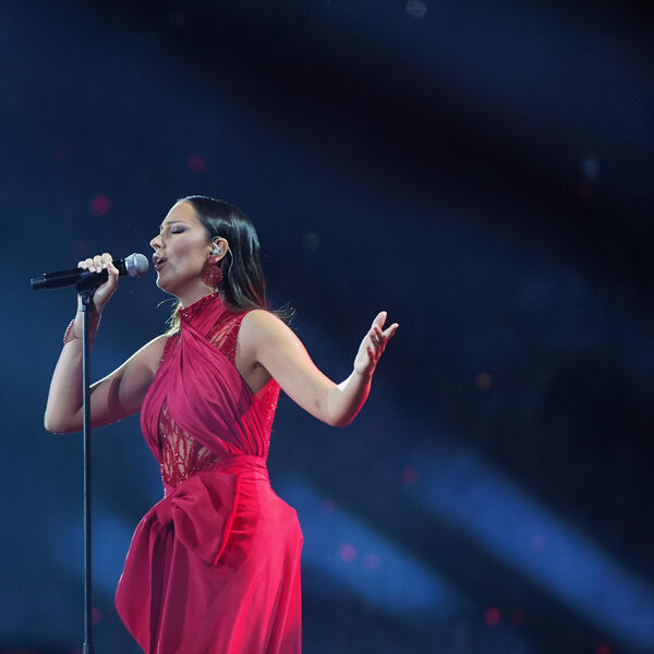 Pevačica se pojavila u dugoj i svetlucavoj haljini sa rukavima, u kojoj je do izražaja došla njena vitka figura, ali i bujni dekolte.