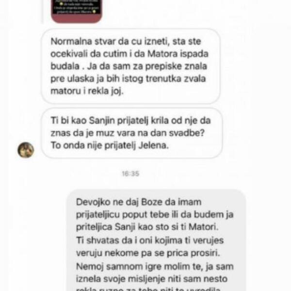 - Pošto sam dobila dosta pitanja vezano za Anu Spasojević, zašto sam je spominjala u storiju juče, pa da objasnim. Devojka kaže da je čekala da Matea dođe u Jagodinu da bi sve svojim očima videla i uporedila, jer nije verovala u to, a ovamo Matea priča da ju je Ana kontaktirala odmah naveče i rekla: ,,Daj mi sve, sutra ću izneti tvoje ime". Ana je znala već da se radi o Matei i Matea je znala da će ova izneti ime, dala joj je odobrenje, a sada priča: ,,Nisam ja ništa objavila, nego drugi". Ma znate šta, evo vama naše prepiske pa lepo pročitajte - napisala je Jelena i dodala: