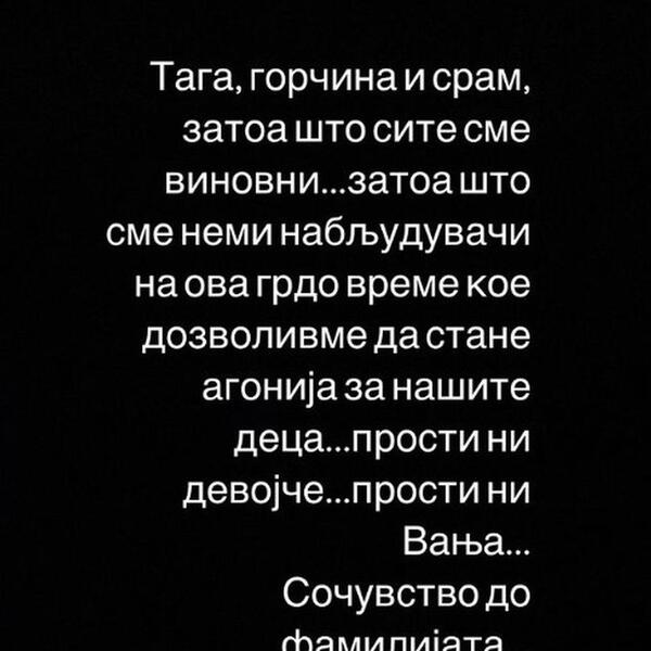 - Tuga, gorčina i sramota, jer smo svi krivi... Jer smo nemi posmatrači ovog ružnog vremena koje smo dopustili da za našu decu postane agonija... Oprosti nam, mala devojčice... Izvini, Vanja... Saučešće porodici... Sve ostalo je tišina...