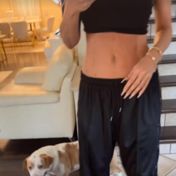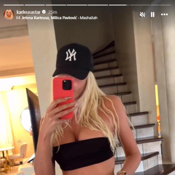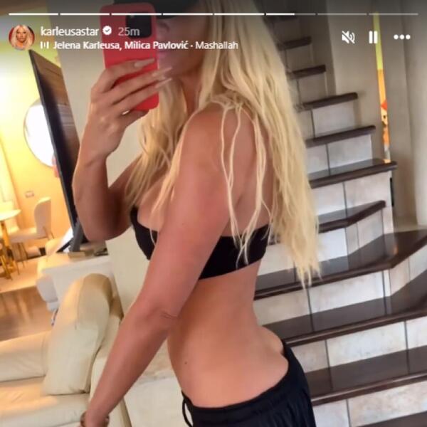 Jelena se snimila u svom luksuznom domu na Dedinju, a na sebi je ponela široku trenerku i kratki topić, koji osim toga što je istakao njene bujne grudi, bacio je akcenat na izvajan stomak i istrenirane trbušnjake.