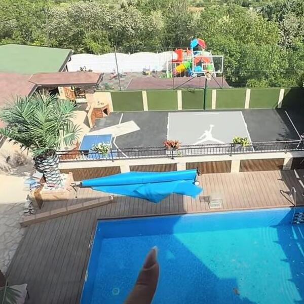 Ogromni dvorište kao iz filma, zelenilo, kamene visoke ograde, palme i fontana ,ogroman prostor za dečije igračke, vila sa ogromnim prozorima odakle puca pogled na zelenilo i prirodu, čak dve dnevne sobe, ogromne garniture, kupatilo sa dva umivaonika, a spavaća soba duž celog zida ima veliko ogledalo i pogled na planine.