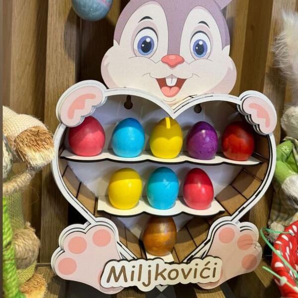 Na sredini je stajao veliki zec, koji je držao šarena jaja, a sa strane su bili manji zečevi, kao i još jedna korpa puna jaja i pilića, a tu su bili i slatkiši.