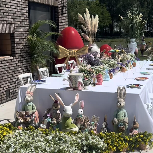 U dvorištu su ogromni zečići i jaja, sa kojima se deca igraju, a Branko je uslikao i pune korpe ofarbanih jaja kao i postavljeni sto u najlepšim pastelin bojama.
