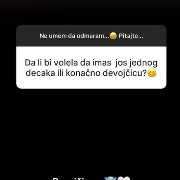 Sada, putem društvene mreže Instagranm, odgovarajući na pitanja fanova ona je otkrila da joj je četvrto dete i te kako u planu. Volela bi, kako je istakla, da danas-sutra sa Slobodanom dobije i jednu devojčicu.