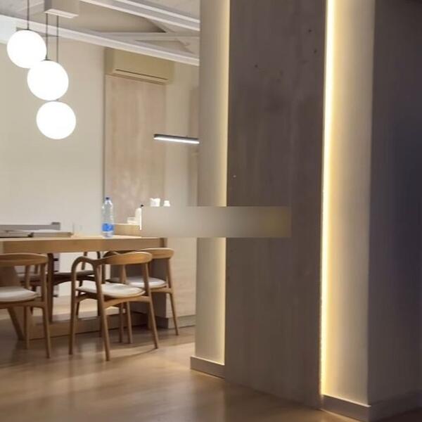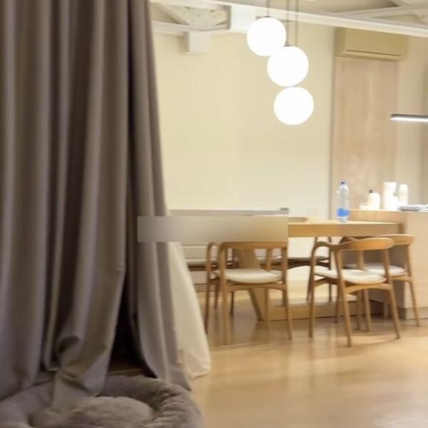 U stanu su visoki plafoni i elegantne zavese koje su se uklopile u postojeći dekor, a iza toga se nalazi i drveni trpezarijski sto sa stolicama koji vodi ka kuhinji.