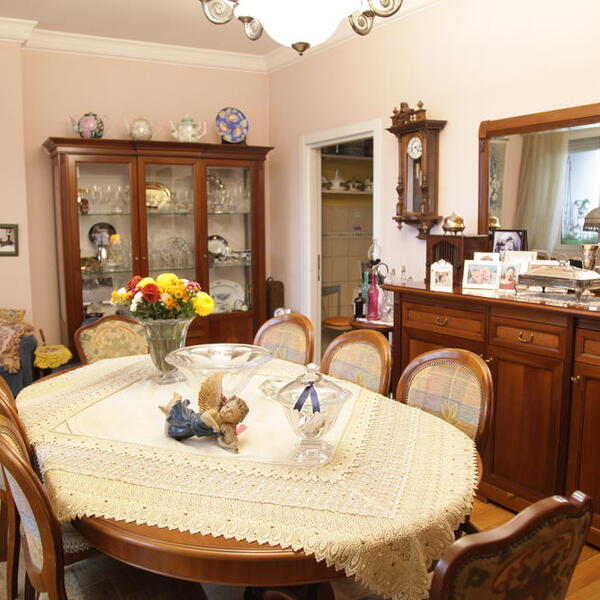 U centru njene trpezarije se nalazi veliki sto za ručavanje, kao i nekoliko polica koje su popunjene porodičnim fotografijama, svećama itd.