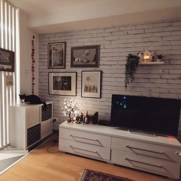Dnevna soba je prostrana, sa slikama na gotovo svakom zidu, a nameštaj u vedrim bojama, među kojima pretenduje bela. Polica za televizor načičkana je raznim ukasima, a ono što su svi primetili jeste i da je baš ona mesto koje njene mačke obožavaju i na kojem često odmaraju.