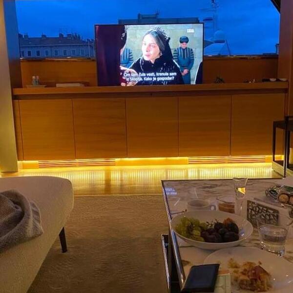 Dnevni boravak je prostran, sa velikim televizorom, a na mermernom stolu, sem poslastica i voća, vidi se i novčanik pun evrića.