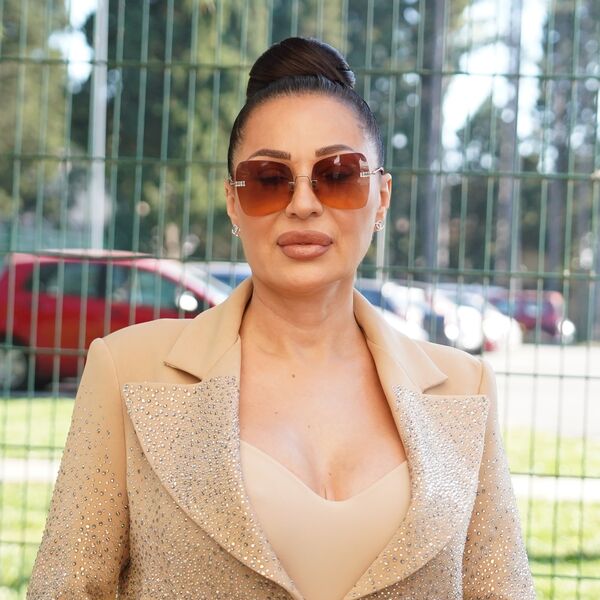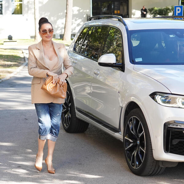 Ona je za današnje snimanje izabrala široki sako u bež boji sa šljokicama, ispod kojeg je nosila korset koji je u prvi pla istakao njen bujen grudi.