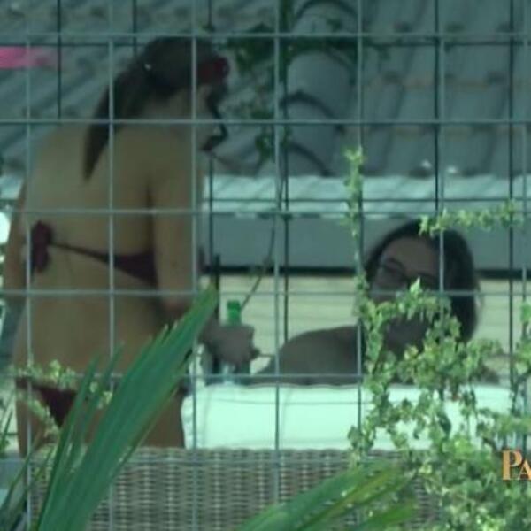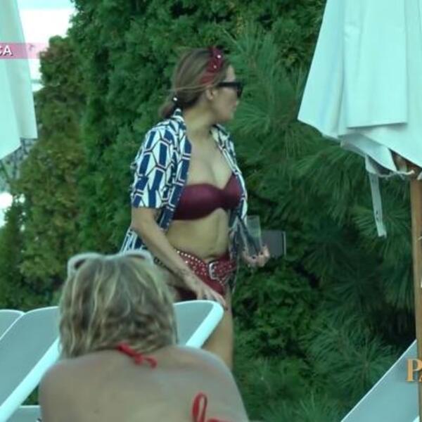 Njih dvoje su kamere emisije "Paparaco lov" prvo usnimile na jednom privatnom bazenu na periferiji Beograda. Pevačica je došla sama, dok su je na bazenu čekali Rale i njena ćerka Tara koja se sve vreme zabavljala i skakala u vodu. Čim je našla mesto koje joj odgovara, Ana se raskomotila, pa je za sunčanje izabrala bordo kupaći kostim sa tanga gaćicama, uz koji je nosila široki kožni kaiš kako bi joj zategao stomak i sakrio nedostatke.