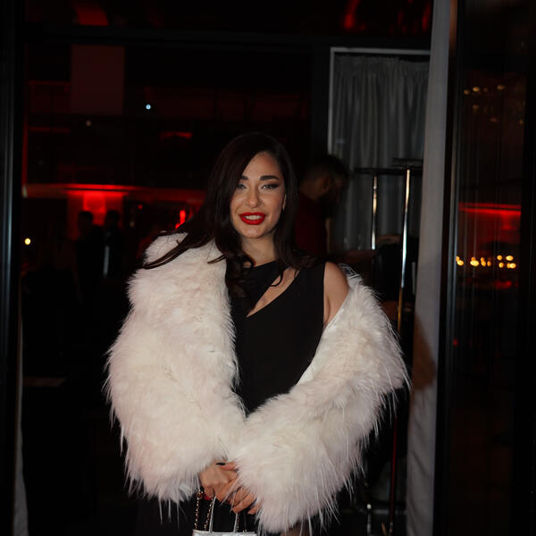 Haljina je imala prorez na ramenima, a stajling je zaokružila belom bundom, crnim hulahopkama i jakim crvenim karminom.