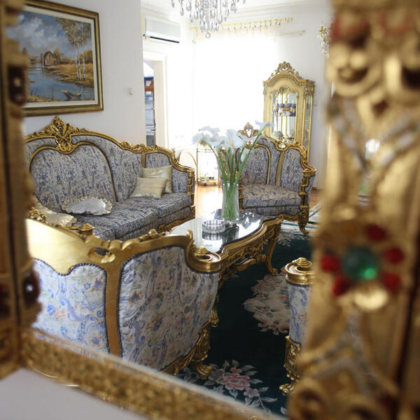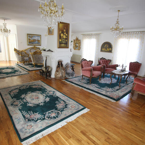 U vili se nalaze antikviteti i zlato, a u dnevnoj sobi smešten je i veliki kamin.