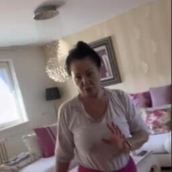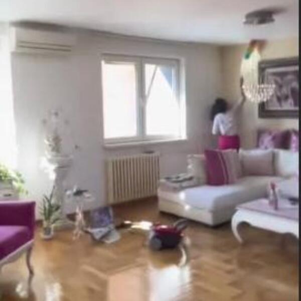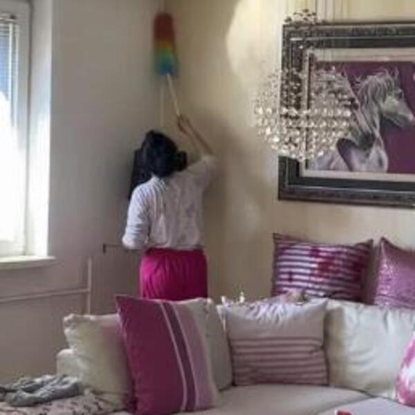 Na snimku se jasno može videti kako Zlata u kućnom izdanju posprema dnevni boravak, koji je veoma prostran, sa ogromnim kaučem i stepenicama nasred istog.