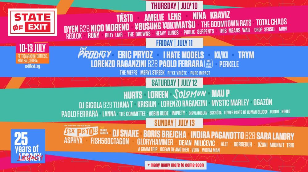 Više od 30 velikih imena pridružuje se jubilarnom 25. izdanju Exita, a predvode ih legendarni The Prodigy, apsolutni hitmejker DJ Snake i globalni house šef Solomun! Novi hedlajneri pridružuju se jakoj postavi koju čine punk ikone Sex Pistols uz energičnog Franka Cartera, rodonačelnik EDM scene Tiësto, elektronski vizionar Eric Prydz, najtraženije umetnice techno scene Amelie Lens, Nina Kraviz, Indira Paganotto i Sara Landry, inovator high-tech minimal zvuka Boris Brejcha, globalna techno senzacija Yousuke Yukimatsu, Bob Geldof sa bendom The Boomtown Rats, britanski pop duo Hurts, dvostruka evrovizijska pobednica Loreen i mnogi drugi.