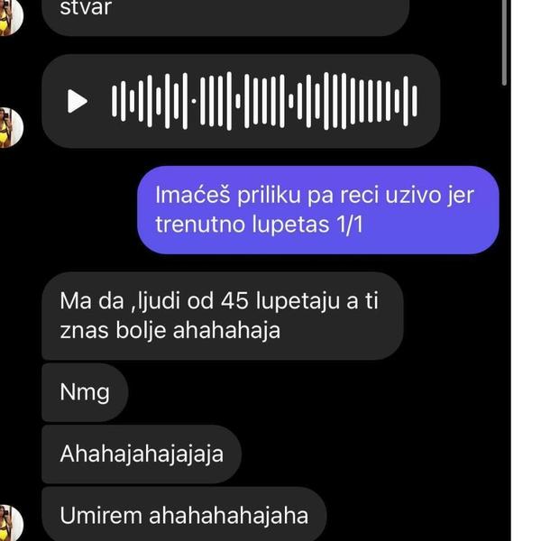 "Po ko zna koji put da je neka “moralna” devojka, ovaj put žena pokušala da dobije naslov preko mene. Dotična pevačica iliti klub igračica je meni pisala danima, pričala o svojoj karijeri, momcima, problemima, a ja sam samo uredno odgovarao sa po 1-2 poruke jer je znam od ranije. Iako je starija od mene 10 godina ona je pokretala provokativne teme čak je i pričala kako obožava mlađe muškarce i da je samo sa takvima i bila u emotivnim odnosima. Što se tiče slike istina je, takva je bila tematika, faktički molila je za nju da bi posle toga slikala i našla da glumi moral. Evidentno je da je samo jedna u nizu žena koje se trpaju po novinama da bi dobile gram medijskog prostora na osnovu mog polnog organa sto je poprilično poražavajuće za tako”ostvarenu”ličnost. Prepiske koje je poslala nisu validne jer je obrisala 80% svojih poruka pa ću ostaviti u prilogu realnu konverzaciju i kako je ona izgledala."