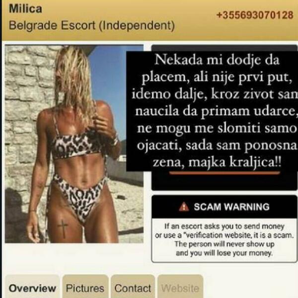 "Nekada mi dođe da plačem, ali nije prvi put, idemo dalje. Kroz život sam naučila da primam udarce, ne mogu me slomiti, samo ojačati, sada sam ponosna žena, majka, kraljica Pokušala sam da kontaktiram ljude, pa ćemo da vidimo da se ovo što pre ugasi. Mnogima hvala na podršci i lepim rečima", napisala je Milica i objavila "njen" oglas na spornom sajtu.