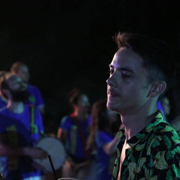 00:45 - Satori u svim stilu šešir i karakterističan print kao I cela scenografija bine. Inače, njegova devojka je vokalista, a on prvi put nastupa sa vokalom.