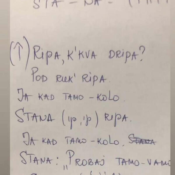 "Ripa, k'kva dripa? Pod ruk' ripa. Ja kad tamo - kolo, Stana (ip,ip) ripa. Ja kad tamo - kolo, Stana: Probaj tamo - vamo. Stana (iiii)", piše u beleškama pevačice.