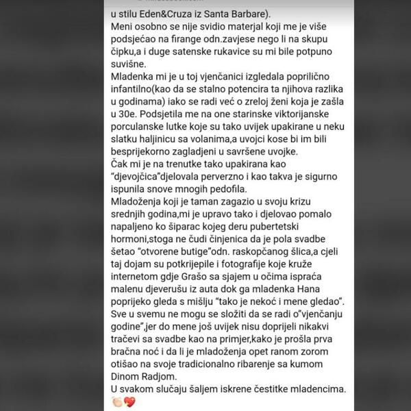 U svojoj objavi na Fejsbuku napisao je sve što misli o venčanju Hane i Petra.