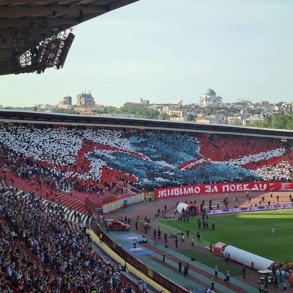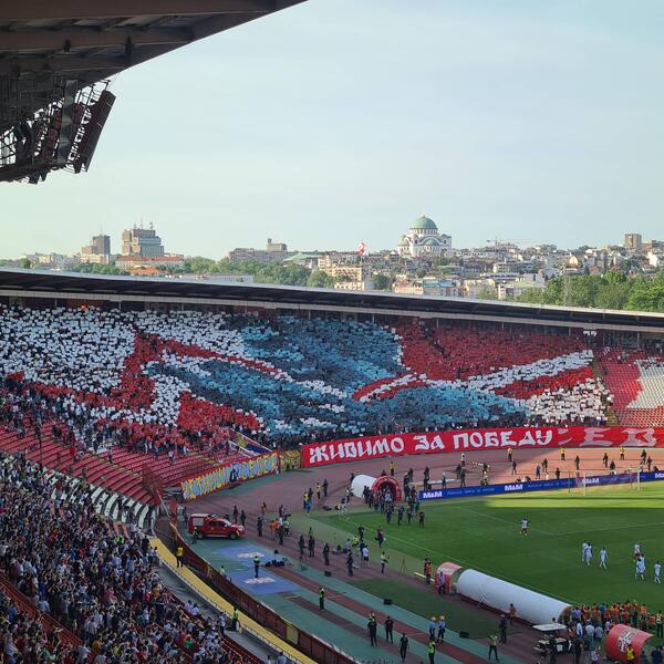 Na stadionu, druga priča. Navijači na severu priredili su koreografiju, na kojoj se nalazi jedan od najvećih simbola Beograda - Pobednik!