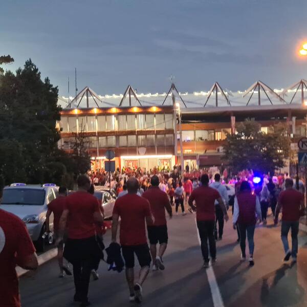 10. minuta: Nema velikih šansi, međutim gostujući navijači su napravili bakljadu koja se spustila na teren koji je u dimu