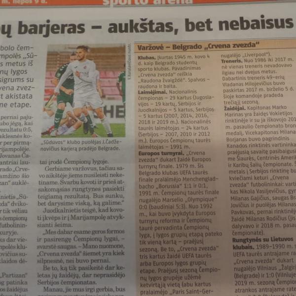 Nisu imali težak posao 2018. godine, pa su u dva meča savladali litvanski tim ukupnim rezultatom 5:0 (3:0 u Beogradu, 2:0 u Marijampolju), ali stiče se utisak da ih sada čeka malo teži zadatak. Suduva je dve godine uzastopno prvak Litvanije, pa samim tim imaju i jači roster i nekoliko kvalitetnih fudbalera. Interesatno, dres kluba iz Marijampolja nose čak sedmorica igrača sa područja Balkana - štoper Živanović, napadači Topčagić i Tadić, zatim defanzivci Švrljuga, Kardum i Kerla, kao i vezista Čađenović iz Crne Gore. Reklo bi se Jugoslavija u malom.