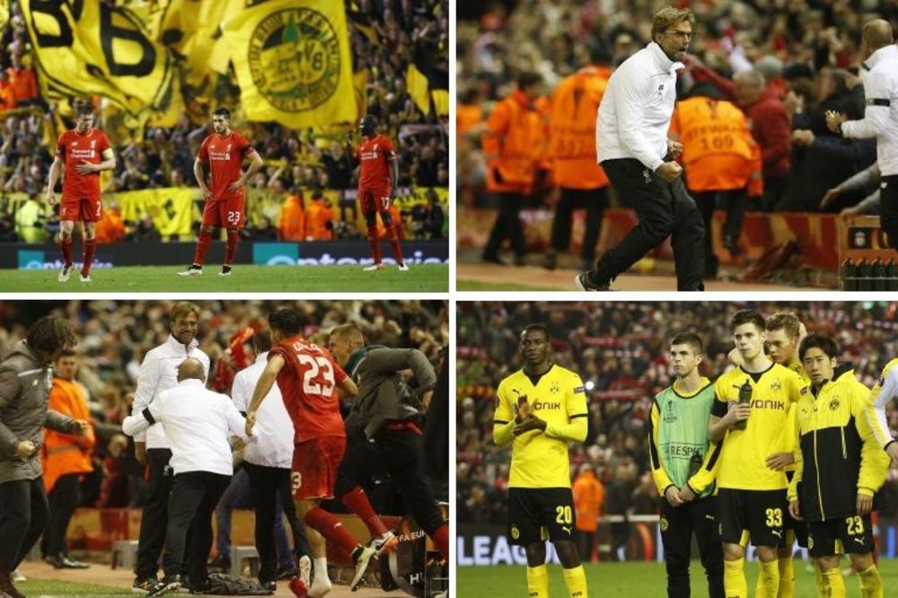Posle atraktivnih dvomeča poznata su sva 4 učesnika polufinala Lige Evrope - Liverpul, Šahtjor, Viljareal, dok je poslednji akter odlučen posle jedanaesterca i to je ekipa, branioca titule - Sevilje. Utakmica večeri je definitivno bila ona koja je odigrana u Engleskoj u kojoj su koplja ukrstili Liverpul i Borusija iz Dortmunda. Posle 1:1 u prvom meču, nemačka ekipa je ušla u dvoboj sa samo jednom namerom - da što pre stekne prednost. To se i desilo već u 5. minutu kada je mrežu zatresao Henrik Mkitarijan. Samo četiri minuta kasnije Obamejang je sjajan način deprimirao "Enfild".