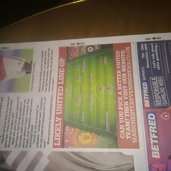 Pored svih pisanija, među kojima se pominje i povratak gorostasnog štopera Erika Bajia u tim, doduše, ne pred meč sa Partizanom, ali ubrzo, najinteresantnije nam je bilo da vidimo kakav tim su Englezi predvideli da će Ole Gunar Solskjer izvesti na megdan izabranicima njegovog starog znanca Sava Miloševića. Iako su srpski mediji, čast izuzecima, pisali da će Đavoli igrati ili sa tri štopera, ili u formaciji 4-4-2, prema pisanju "Manchester Evening News"-a formacija u kojoj će izaći na teren biće 4-2-3-1. Na golu, nažalost, neće biti slavljenik David de Hea, koji se oporavio od povrede i primio gol kroz noge od Bornmuta ovog vikenda, već najbolji rezervni golman Premijer lige - Serhio Romero. Odbranu će činiti povratnik, kapiten Ešli Jang, Hari Megvajer (koji je nosio traku u njegovom odsustvu), Markos Roho i Brendon Vilijams, dete Junajtedove škole. Kao dva zadnja vezna nastupaće Mektominej i Garner, ispred njih biće Huan Mata, po bokovima Grinvud i Džejms, dok bi kao usamljeni napadač trebalo da se pojavi Antoni Marsijal. Dakle, sličan igrački kadar, ali različita formacija nego u Beogradu, ako je verovati lokalnim medijima. Što se sastava Partizana tiče, njega vam nećemo otkrivati iz takmičarskih razloga.